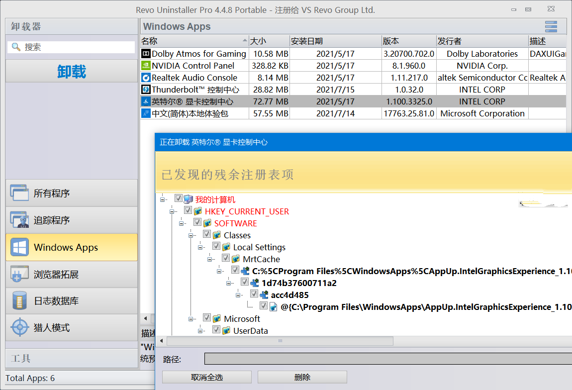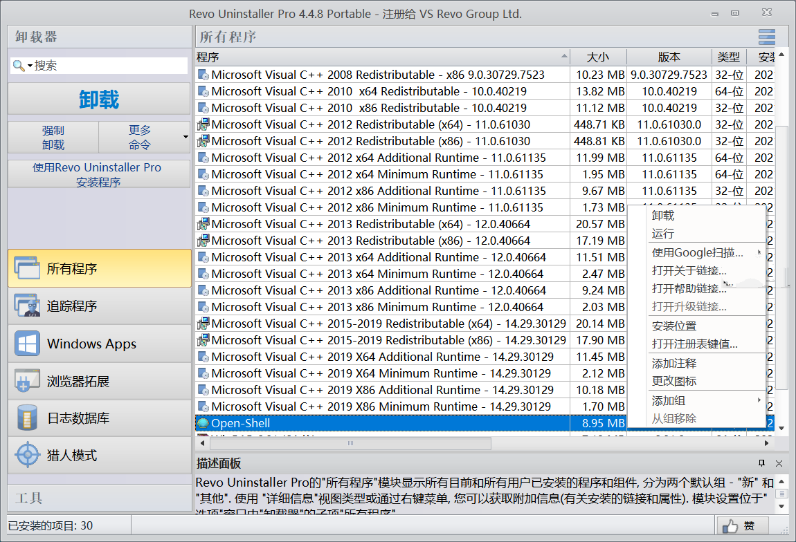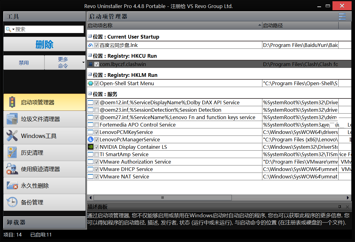 Revo Uninstaller Pro,软件强制卸载工具,一款国外优秀的专业软件卸载程序,有猎人模式、安装跟踪监视改动、强制卸载扫描分析、启动项管理、使用痕迹清理、垃圾文件清理、浏览器垃圾清理等诸多功能。