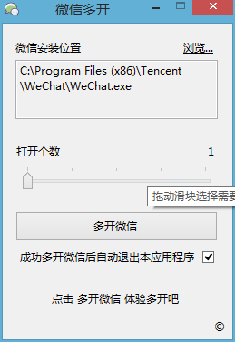 微信多开工具是一款能根据设置的多开数量自动打开多个微信的小工具,同时能结束正在运行的微信,绿色软件,不写注册表和磁盘,默认勾选多开后退出,微信安装位置从注册表读取,也可以手动指定位置。