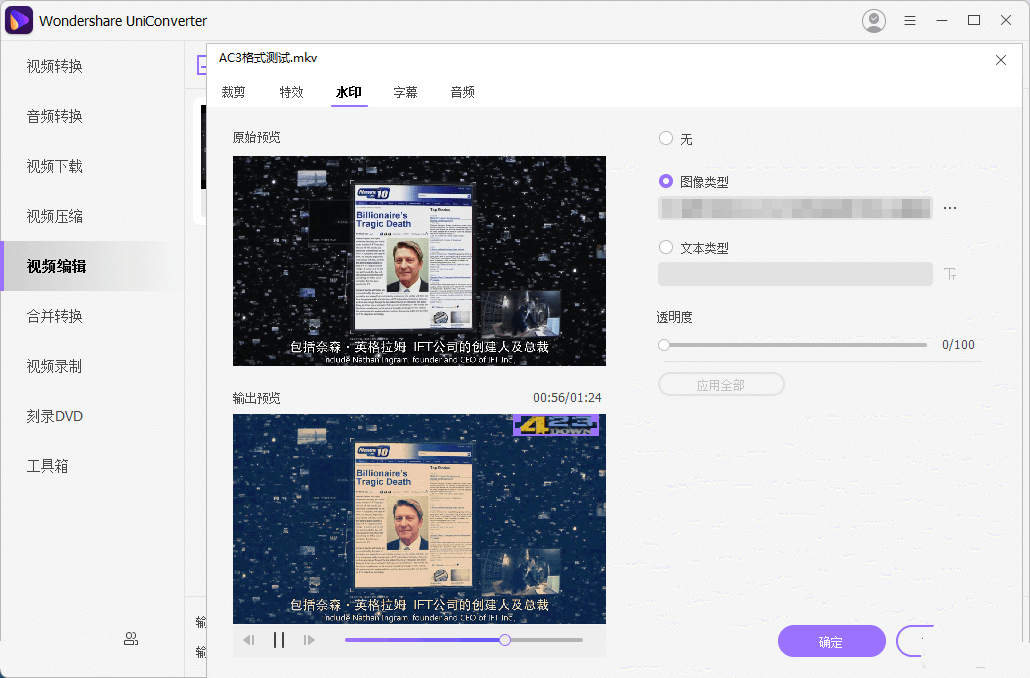 Wondershare UniConverter(万兴优转)国产专业全能音视频格式转换器。具有音视频格式转换、合并视频、视频压缩、视频编辑、视频录制、下载视频、DVD刻录、元数据修复、VR视频转换、字幕编辑器、GIF制作、CD刻录等一站式视频工具箱功能。万兴转换器,以超快的转换速度及专业的功能在国外名声大噪,转换速度号称是市面同类产品的30倍,支持158种视频格式无损转换,批量转换高清视频不丢关键帧