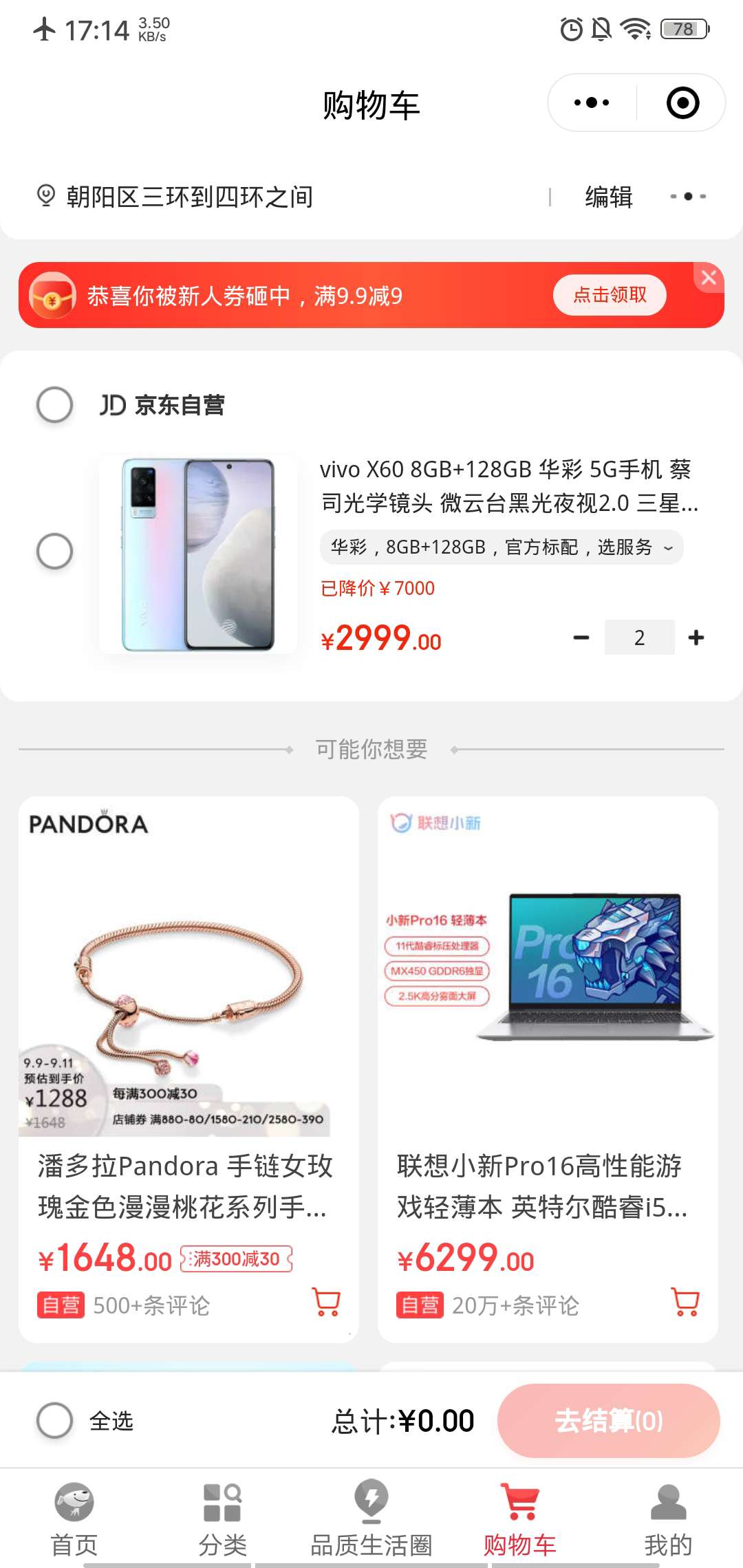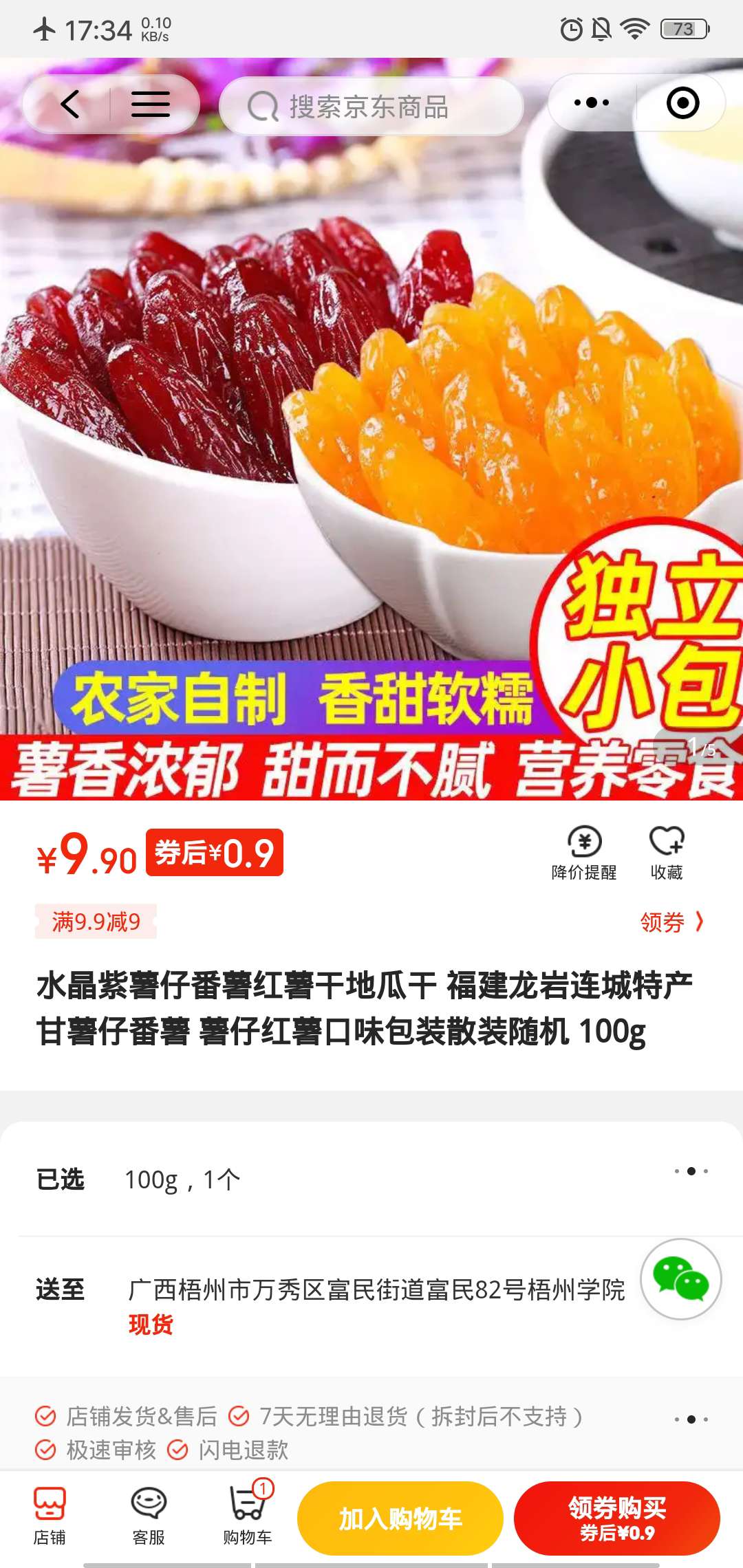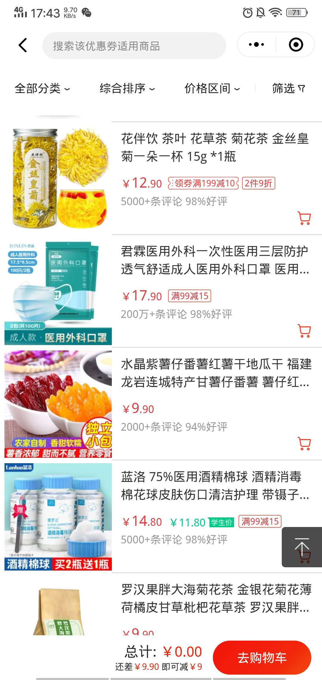微信小程序京东购物→进去等几秒会有1.5元红包→领取了然后点下面的购物车(图二样式)→看到顶头有满9.9减9就领取(没有的话无视)→领了9.9的就点去使用(这个券限制购物方向,大多都是健康类的,口罩,泡茶啥的)→想要地瓜干的就下滑找到地瓜干,想要阿胶枣的就进地瓜干的店铺找到阿胶枣→下单会显示支付0.9→先不着急下,点1.5的红包,会让你进行支付密码设置(我的就是设置支付密码)→设置完了就是0.01了