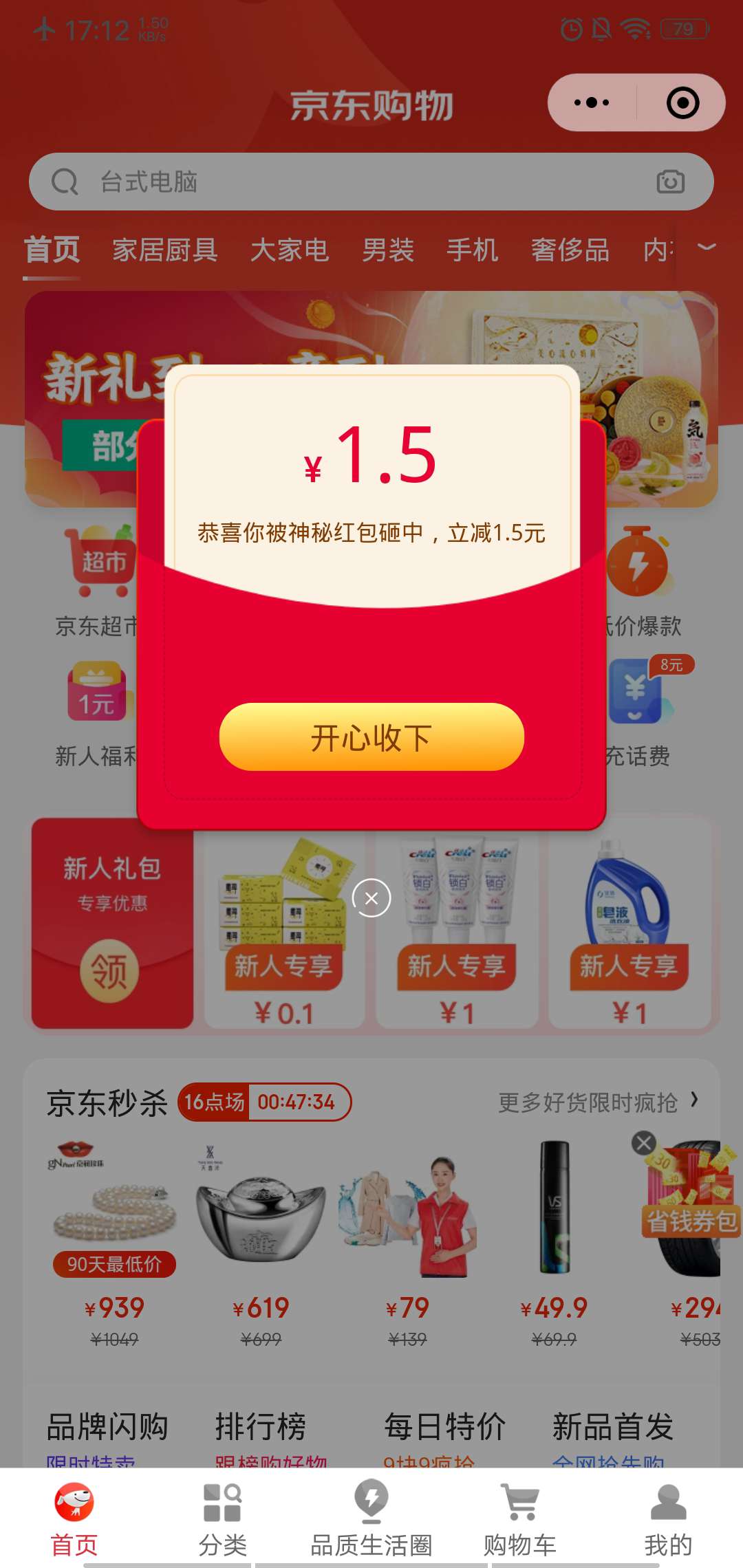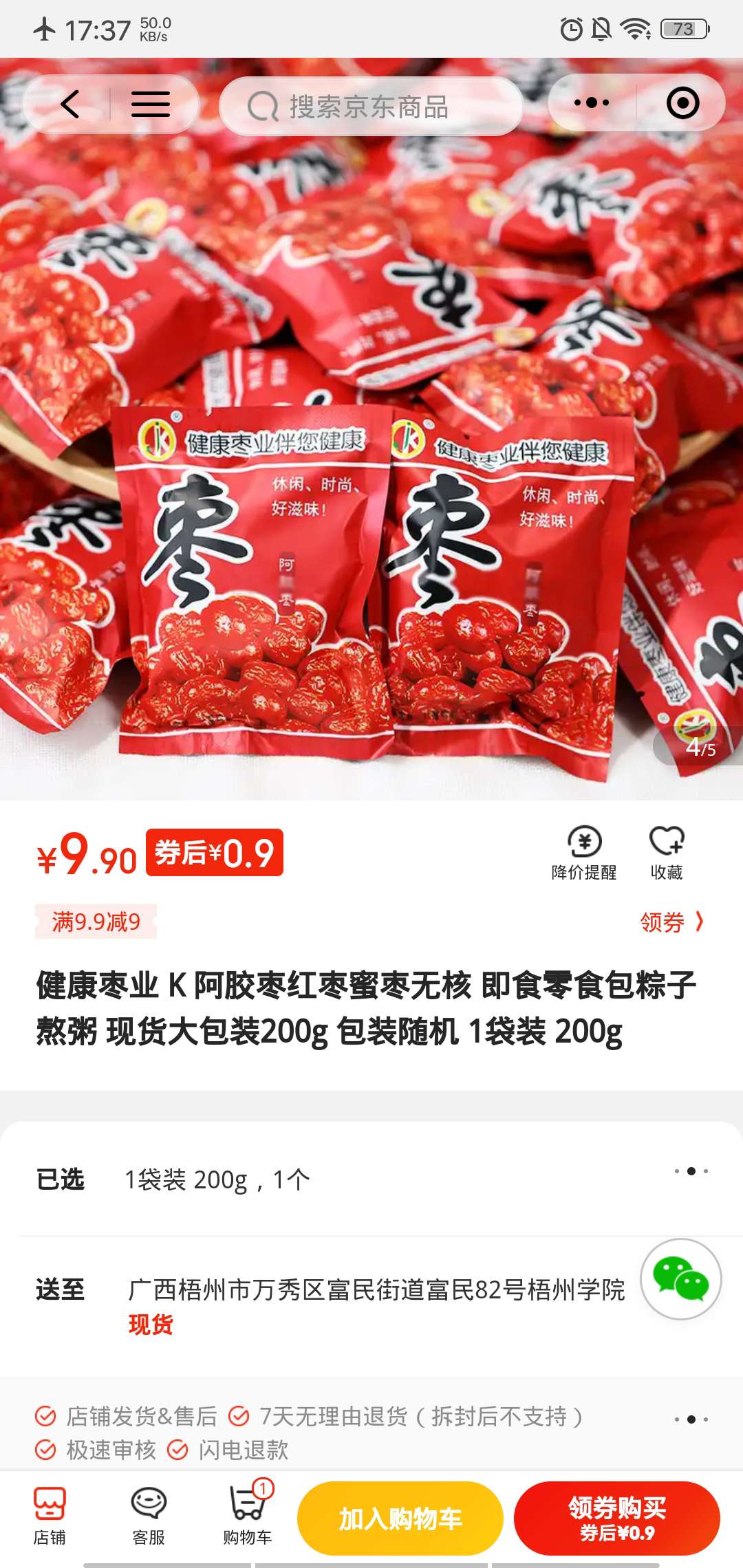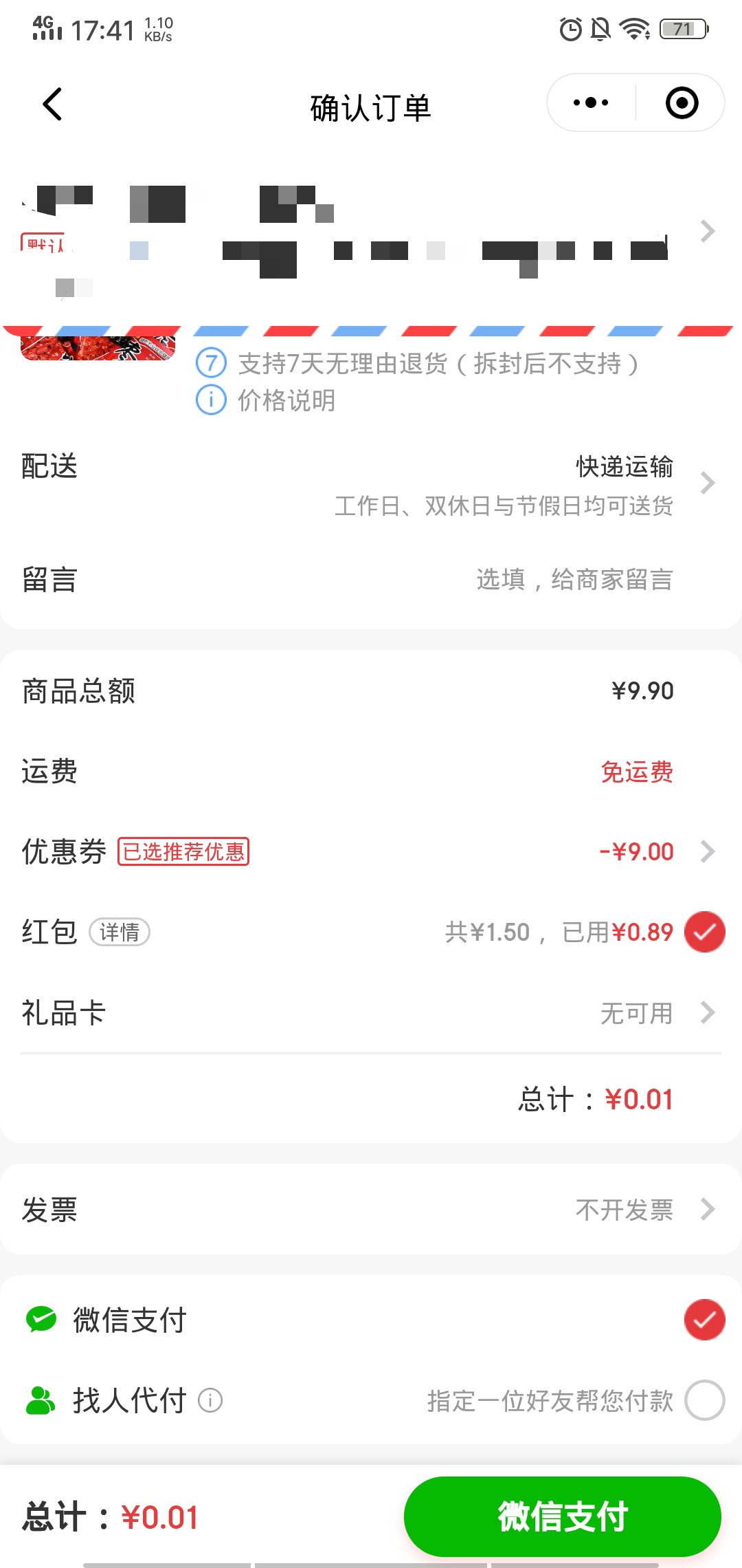 微信小程序京东购物→进去等几秒会有1.5元红包→领取了然后点下面的购物车(图二样式)→看到顶头有满9.9减9就领取(没有的话无视)→领了9.9的就点去使用(这个券限制购物方向,大多都是健康类的,口罩,泡茶啥的)→想要地瓜干的就下滑找到地瓜干,想要阿胶枣的就进地瓜干的店铺找到阿胶枣→下单会显示支付0.9→先不着急下,点1.5的红包,会让你进行支付密码设置(我的就是设置支付密码)→设置完了就是0.01了