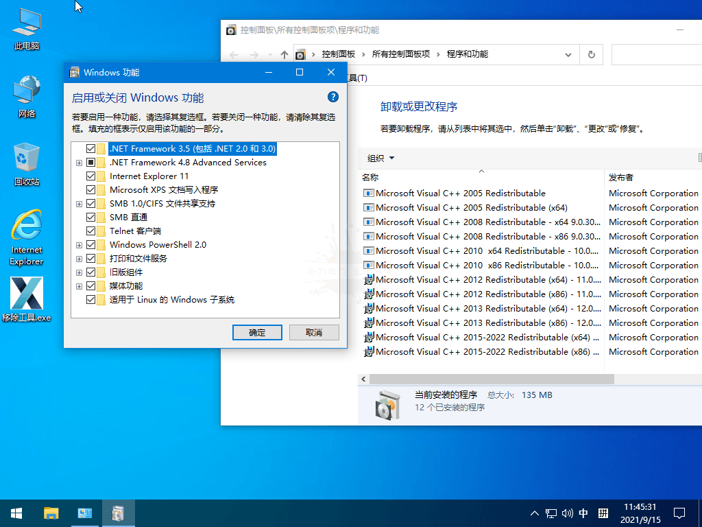 IE、ODBC、简体输入法、蓝牙、wifi、xbox驱动、bitlocker、防火墙、画图、Mstsc、触摸、Linux子系统、平板