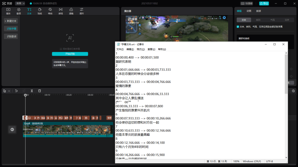 3.使用剪映识别字幕功能自动生成字幕。