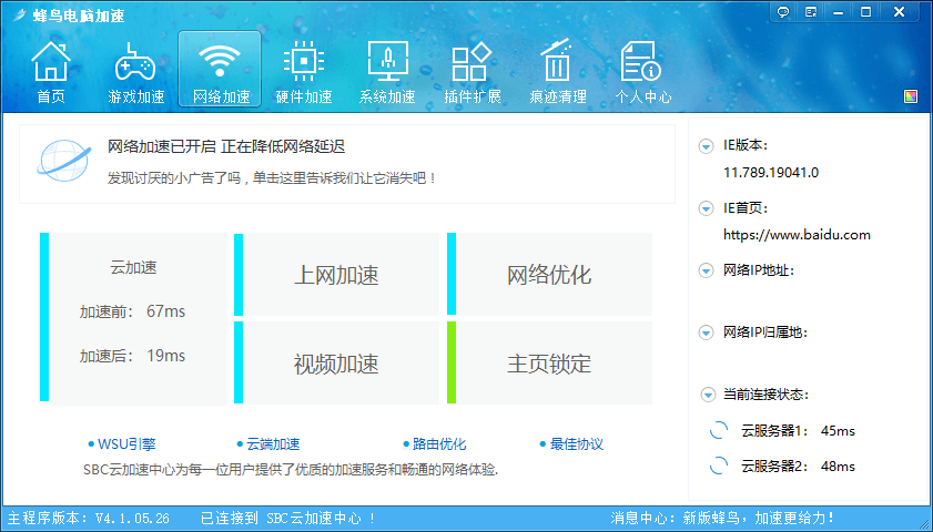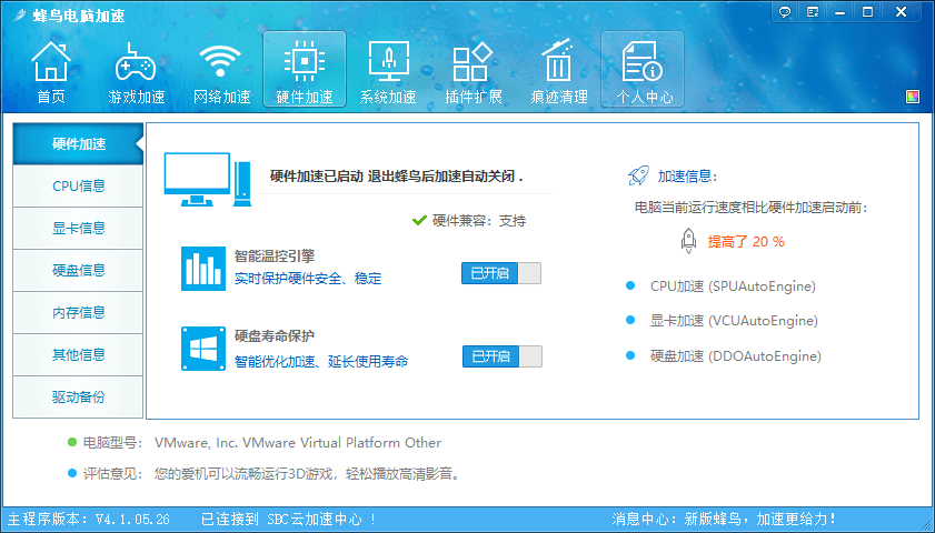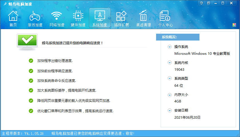 蜂鸟电脑加速是一款功能非常齐全的电脑优化加速软件,软件更新时间为2016年6月2日,该软件具有游戏加速、网络加速、硬件加速、系统加速、智能温控、实时加速、插件拓展、垃圾清理等诸多功能,能够帮助用户显着提升电脑速度。