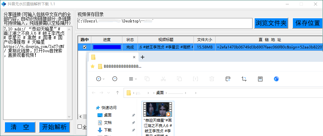 这是一款支持抖音无水印直链解析下载工具,支持批量下载视频,全部高清无水印,满速下载,复制粘贴链接自动识别,开始解析成功后便可快速下载无水印视频。