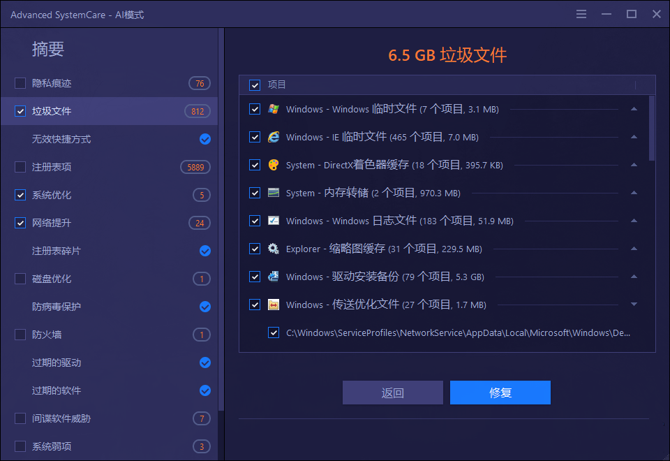 IObit Advanced SystemCare,系统清理维护与安全防护软件,大幅提升整体系统性能和安全!一键AI智能模式,全面扫描优化修复系统,拥有性能加速模式、系统优化、网络加速、启动项优化、软件更新、实时监视清理、隐私安全保护等功能,可以防病毒及间谍软件,浏览器跟踪保护隐私,保护电脑免受病毒攻击。