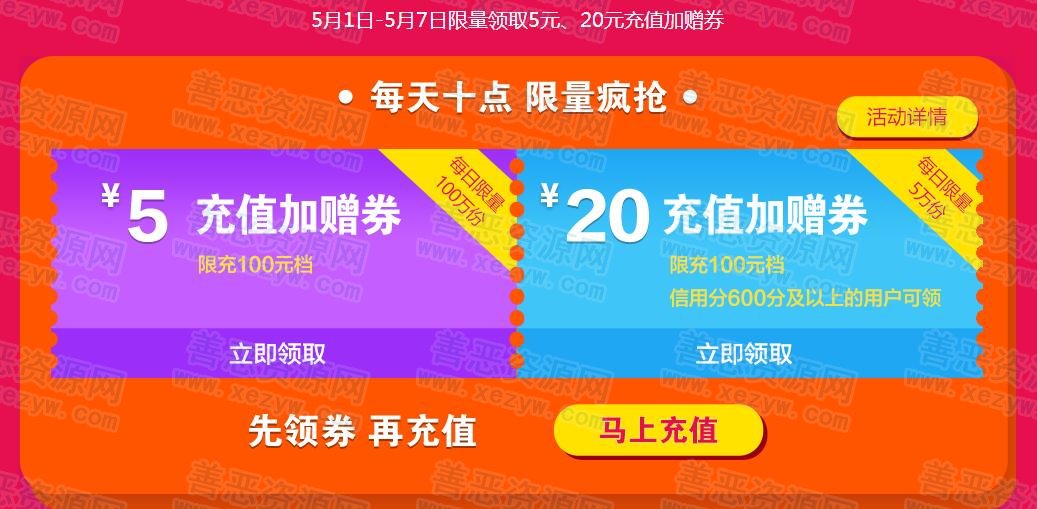 5元的每天限量100万份,20元的每天限量5万份(需信用分600以上才行)。