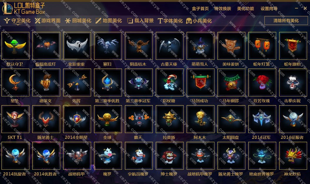 这个LOL凯特盒子是一款英雄联盟美化工具,支持特效皮肤、守卫美化、小兵皮肤、峡谷地图、HUD、段位框一键换肤