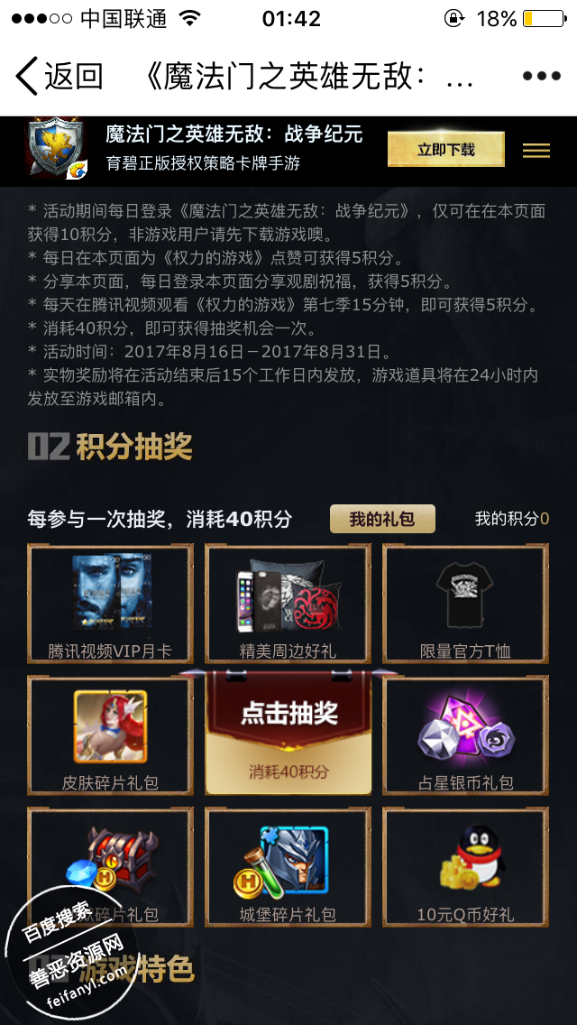 使用40积分可以抽奖 抽10Q币 腾讯视频VIP月卡 电影周边