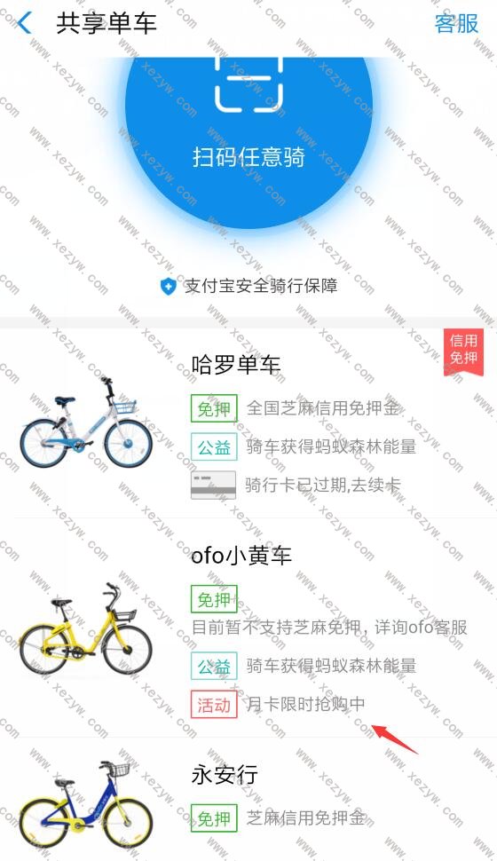 打开支付宝首页->更多->便民生活->恭喜单车->找到ofo进去买月卡,1元1月可买4次