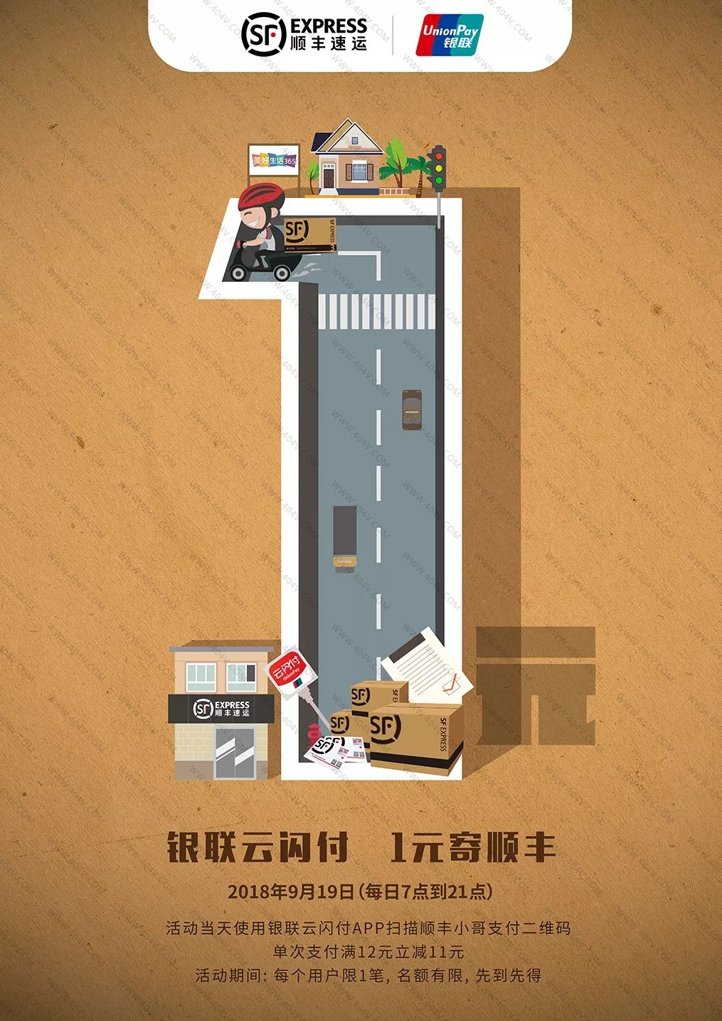 使用云闪付支付顺丰快递费,满12元减11元,仅限9月19日一天,共5万个名额,先到先得。