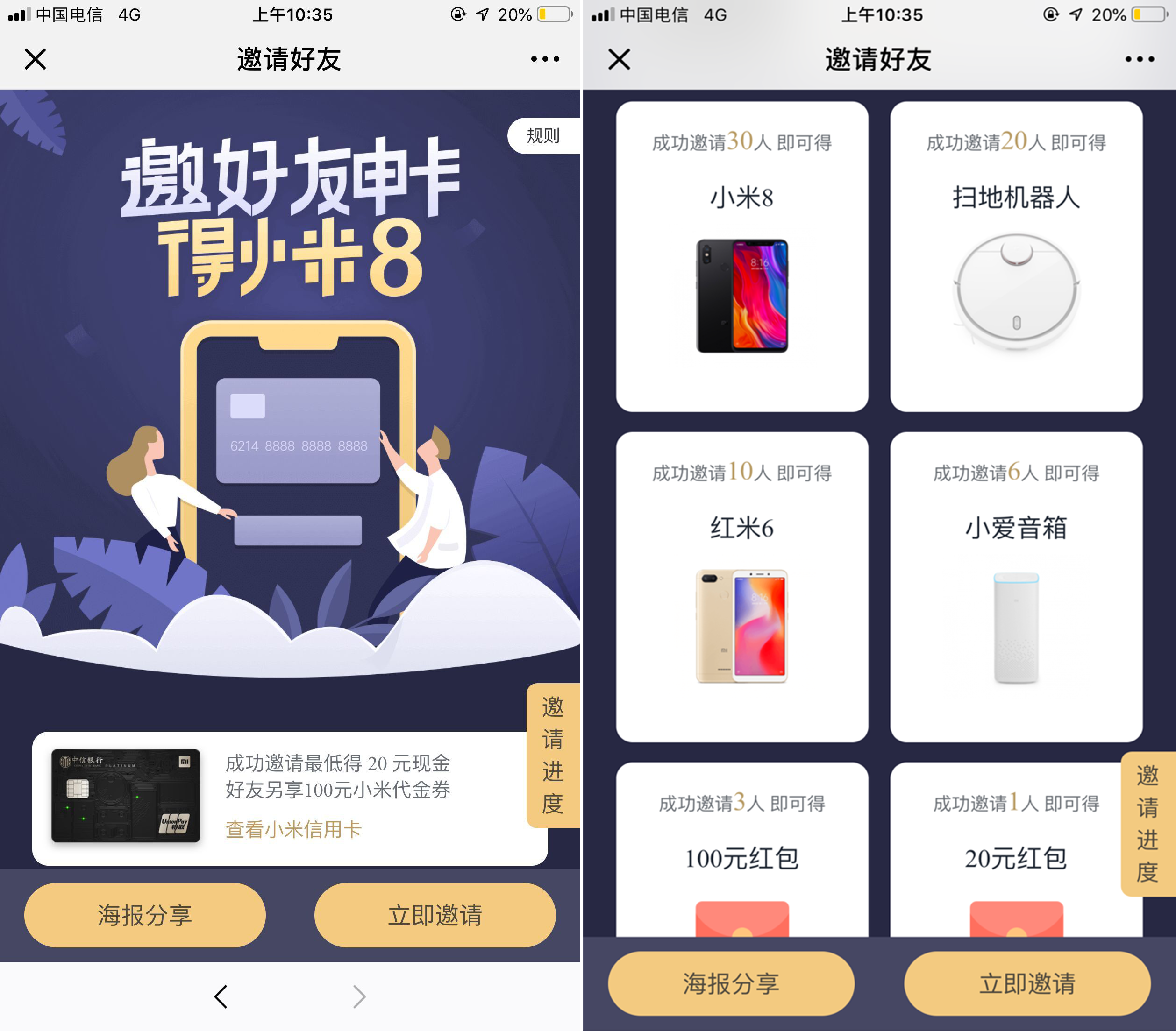 被邀请人办卡可以得100元小米商城无门槛券撸实物,邀请人奖励如图,大家可以互走