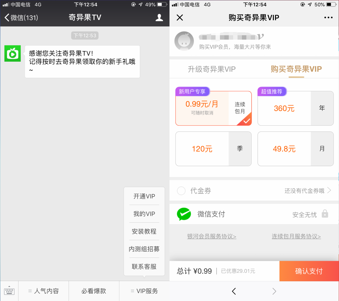 1、微信扫码关注奇异果TV->VIP服务->开通VIP->首次开通需要开通自动续费