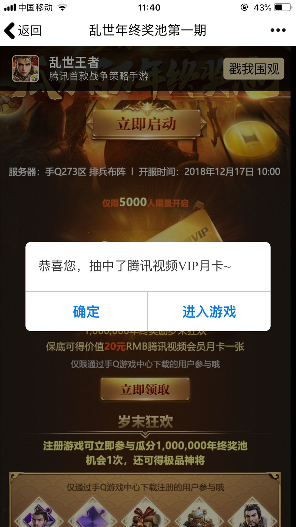手机QQ扫码->下载乱世王者->QQ登录->273区->返回活动领取秒到