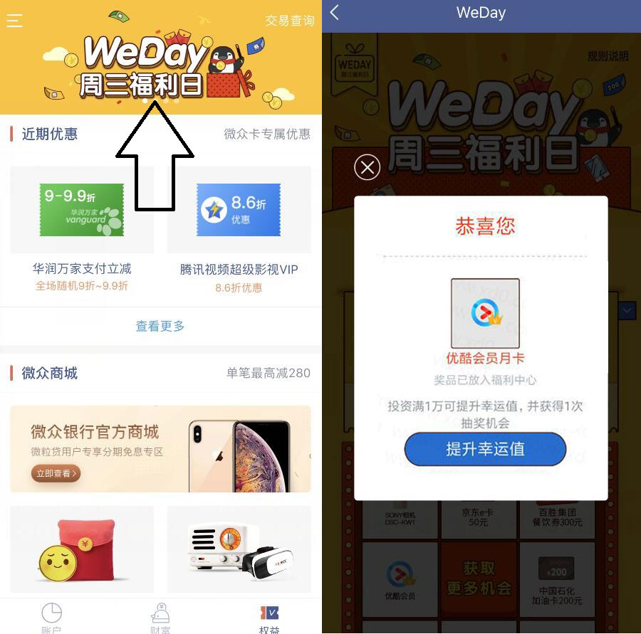 载微众银行APP-登录-权益-顶部图片-周三福利日-进去抽奖即可