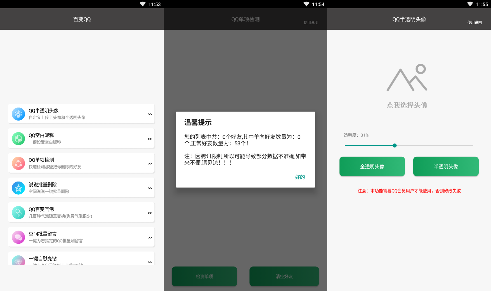 透明头像、空白名、单项检测、批量删说说、百变气泡、空间批量留言、自慰亮钻、字体管家、QQ挂件修改