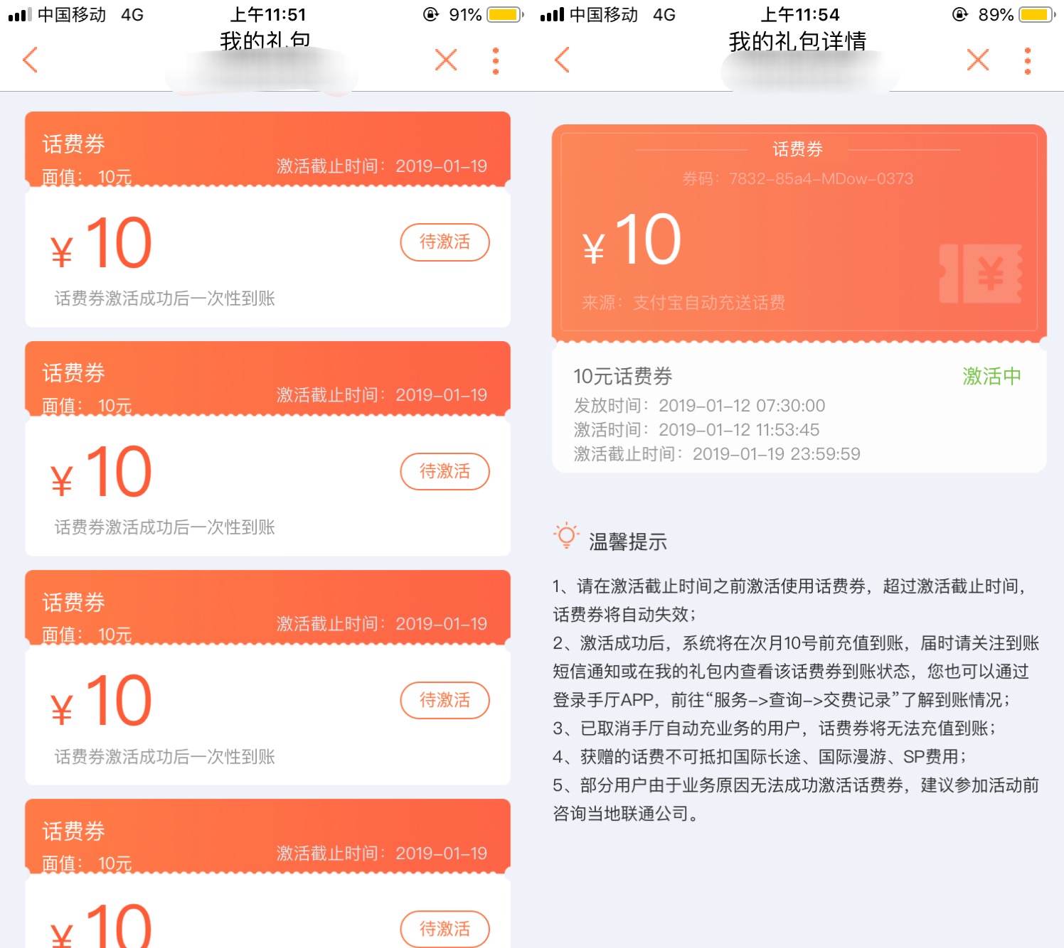 到账有延迟,五六个小时这样,打开手机营业厅APP->我的->我的礼包->话费券(4*10元)