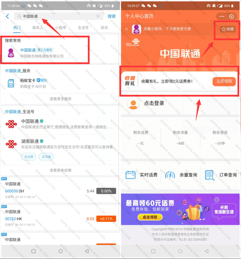 1、支付宝APP首页搜索“中国联通”->进入小程序->点顶部收藏