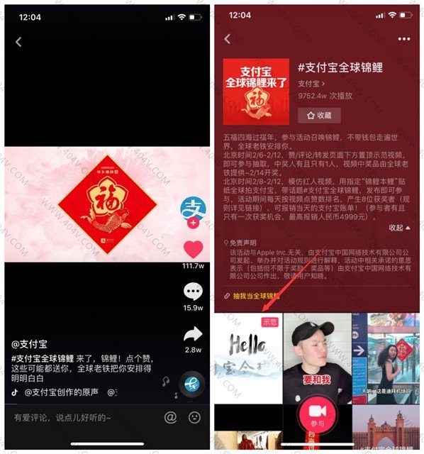 另外拍摄模仿红人视频 用置顶“锦鲤本鲤”贴纸全球拍支付宝 带话题发布按照排名也可以抽八位清空购物车
