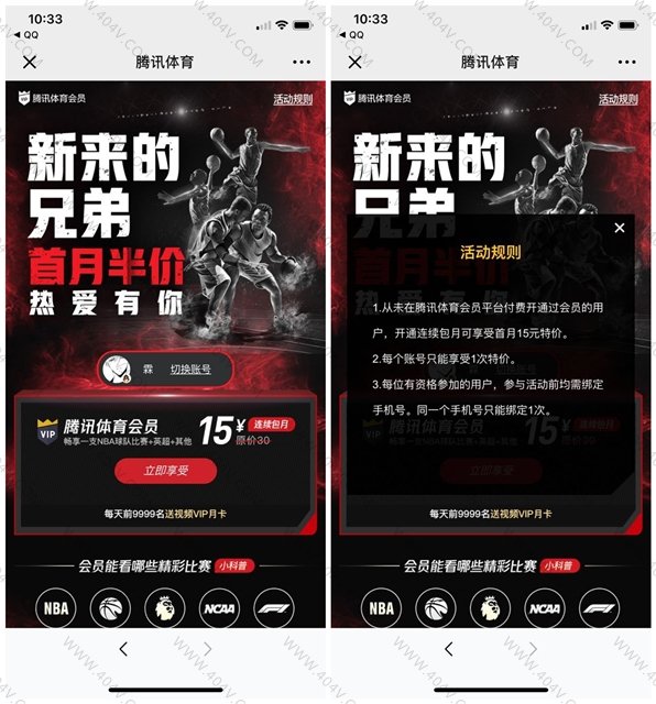 微信扫码登录账号 开通腾讯体育会员连续包月 前9999名可以赠送腾讯视频VIP月卡