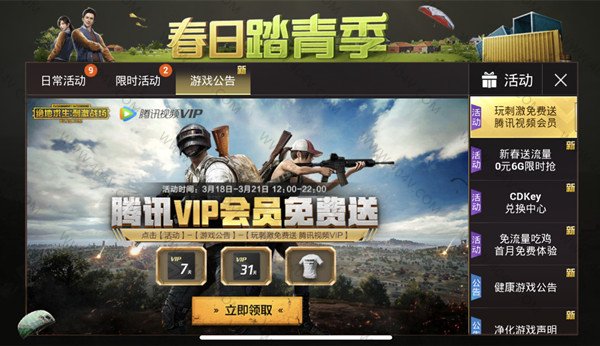 活动地址:绝地求生刺激战场--活动---游戏公告