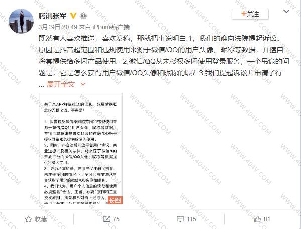 腾讯指控的缘由是 抖音违法诚信原则超范围和违规使用来源于微信/QQ用户的昵称、头像等数据提供给
