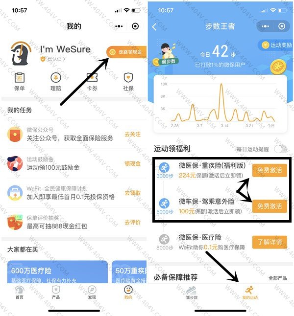 进入小程序后点击我的--右上角【走路领现金】--【我的运动】领取前面2个保险 领取完后返回