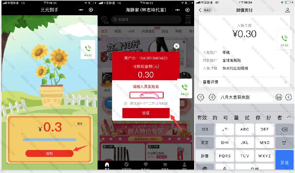 进去点提现->跳转输入微信名字->滑动验证->提示频繁到账0.30~