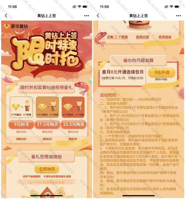 活动可以9元开通1个月豪华黄钻+1次抽奖机会 限购10次