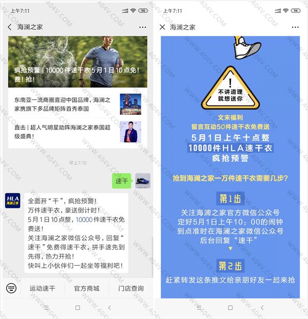 一共10000件HLA速干衣 需要先关注公众号 设置10点整闹铃回复【速干】
