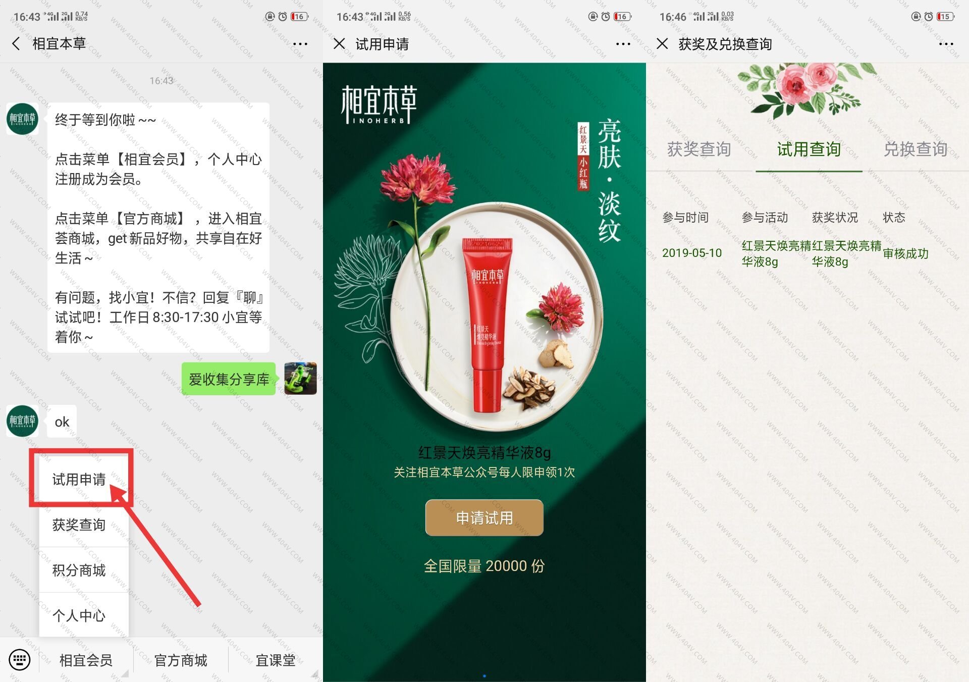 菜单栏进入-试用申请->填地址申请领取即可!
