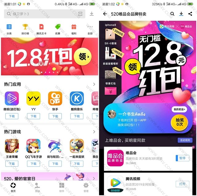 在应用宝首页顶部滚动幻灯片横幅可以看到“12.8元红包”进入界面