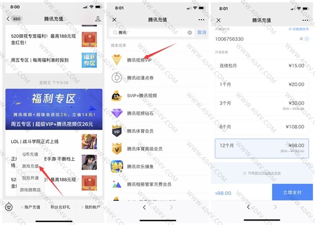 微信公众号搜索“腾讯充值”菜单栏打开 账户充值 - 游戏充值 - 腾讯视频VIP 充值即可