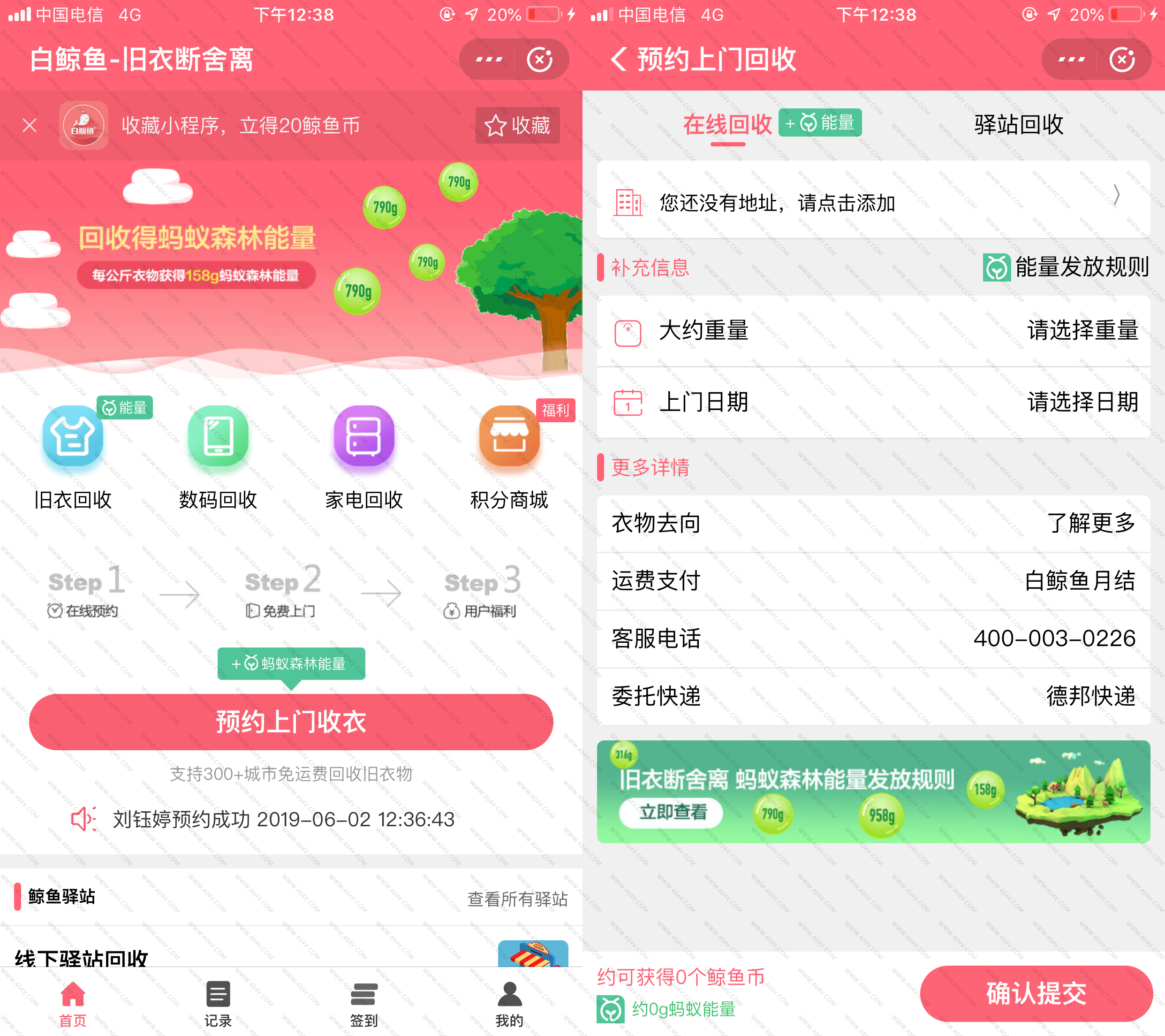 预约上门收衣,不需要运费,按重量比例可以得到不同的蚂蚁森林能量