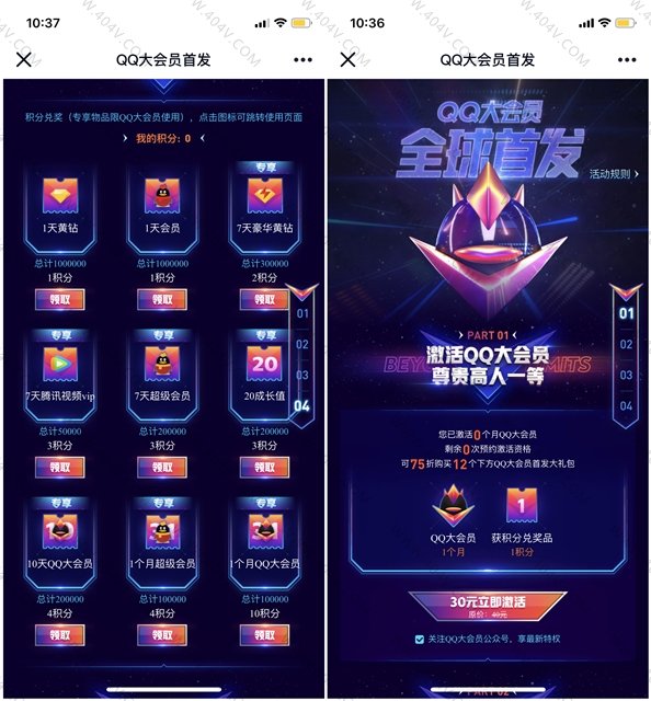 手机扫码进入活动界面 30元即可开通大会员比原价40折扣了10元另外还有积分 积分可以兑换各种钻和奖品