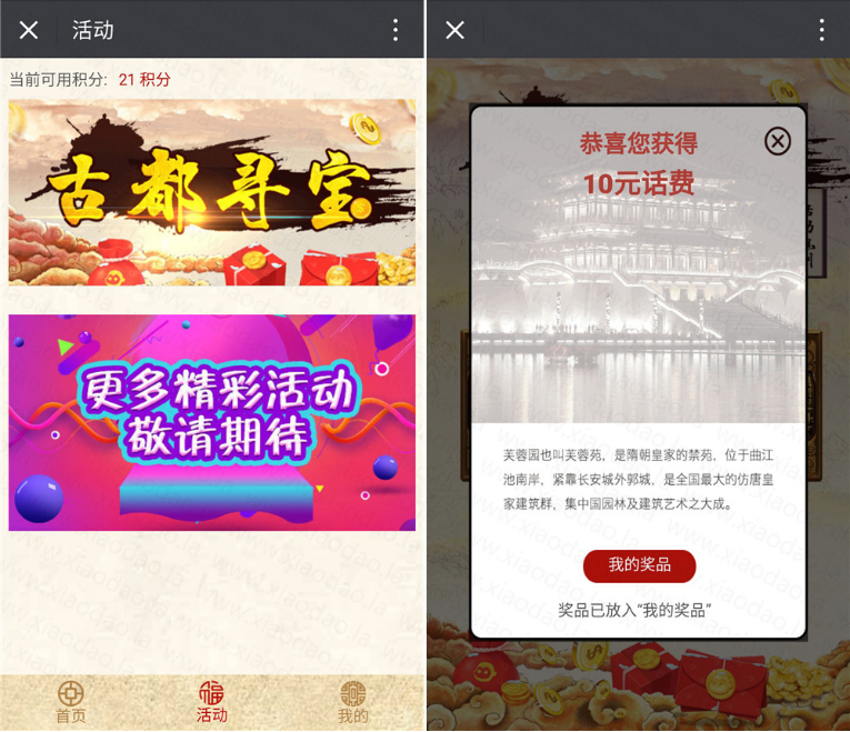 2、然后点击菜单栏【积分签到】进入【活动】【古都寻宝】抽奖