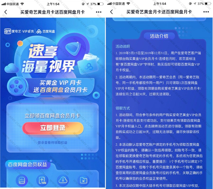 开1月爱奇艺会员送1个月百度网盘会员