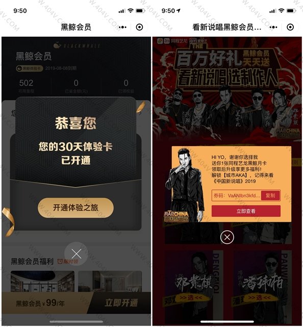 看新说唱免费领取同程艺龙黑鲸会员1个月