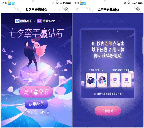 打开百度APP-我的-活动中心-点击“七夕牵手赢钻石”进入活动页面