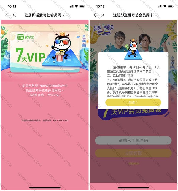 本活动下载【蜂助手APP】先不需要注册 在首页点击[爱奇艺7天会员免费领]进入输入手机号填写验证码