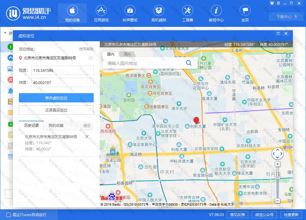 1.手机数据线连接电脑,打开i4助手->虚拟定位