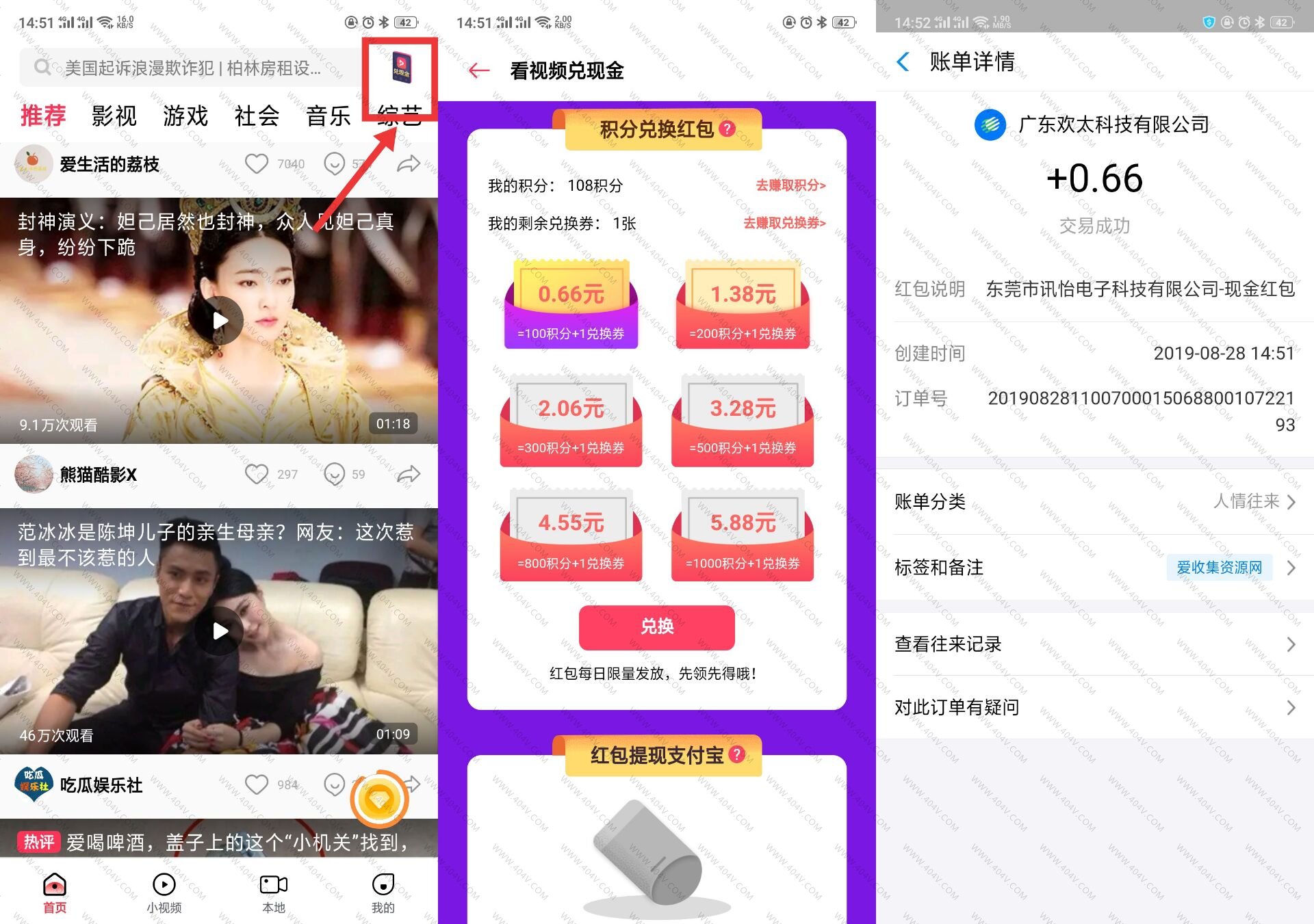 打开自带的短视频APP-首页右上参与-看视频兑换