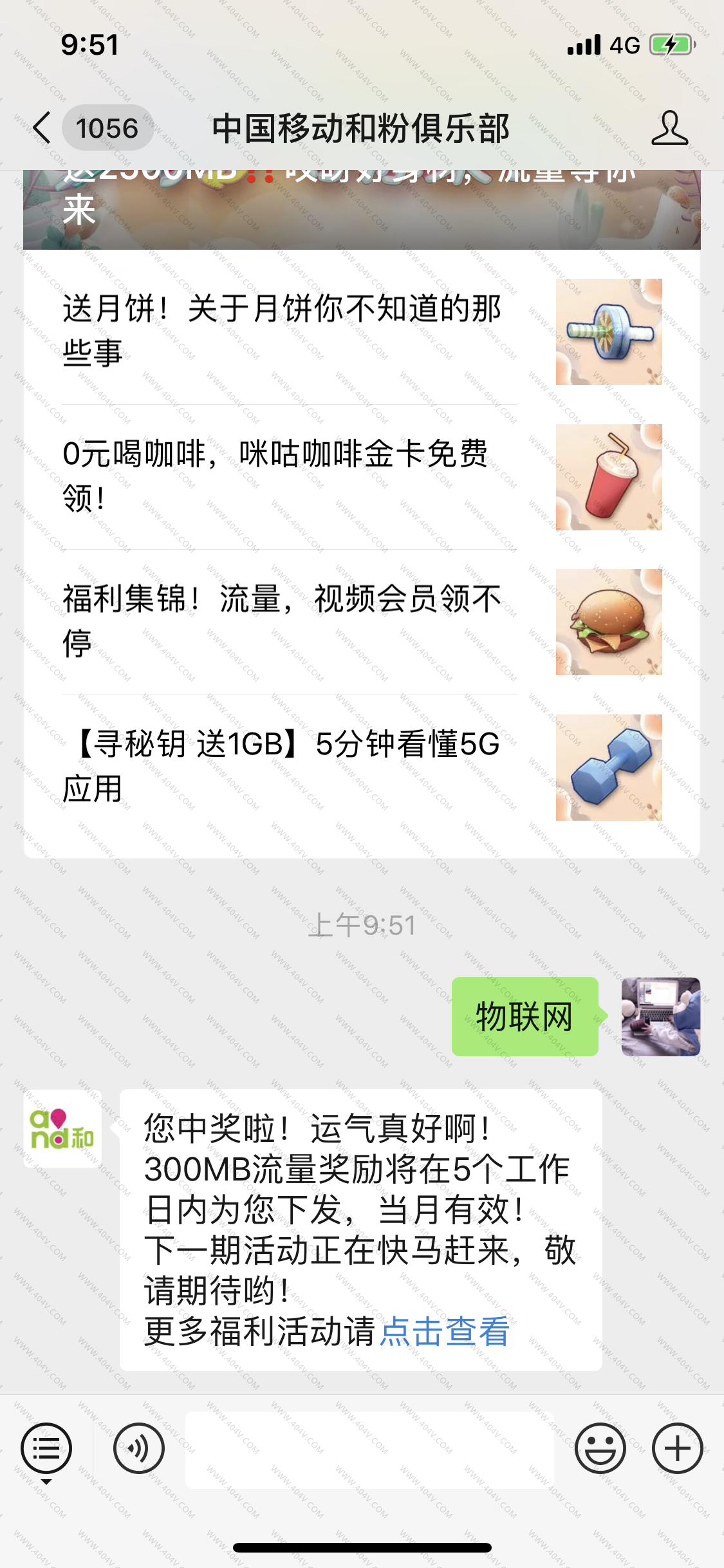 微信搜索关注公众号“中国移动和粉俱乐部”然后回复关键字:物联网