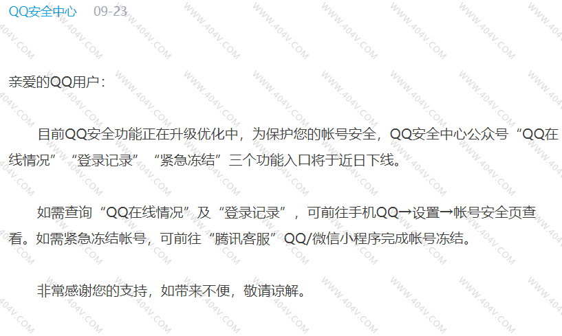 今天QQ安全中心发出公告:“QQ安全中心”公众号“QQ在线情况”“登录记录”“紧急冻结”三个功能入口将于近日下线
