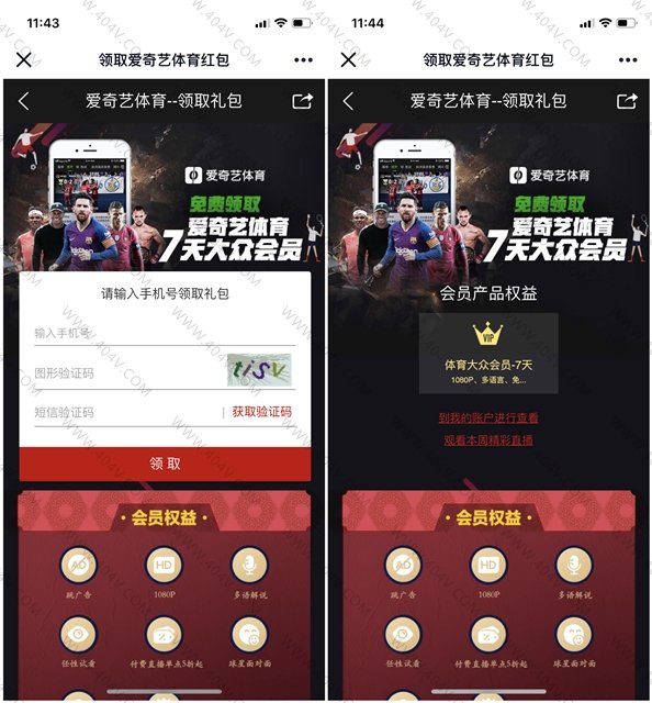 在活动界面输入手机账户接码即可领取爱奇艺体育大众会员7天