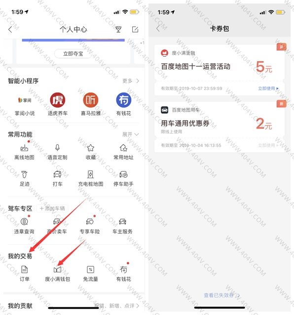 然后返回首页点击右上角的个人头像 - 下拉找到度小满钱包 - 卡券包 - 使用 满10元即可使用