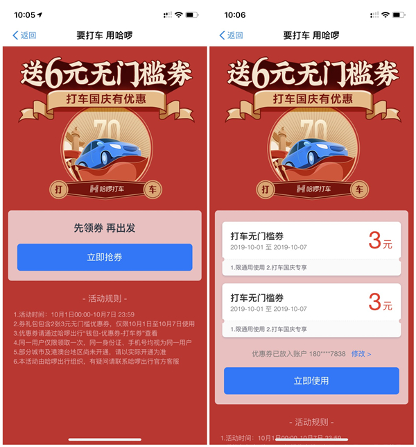 免费领取2张3元哈啰打车国庆打车券 需要的上