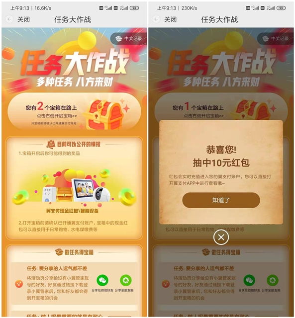 有机会获得红包 非必中 中奖后 红包直接到翼支付余额 可以用于生活缴费 充值话费 购物等