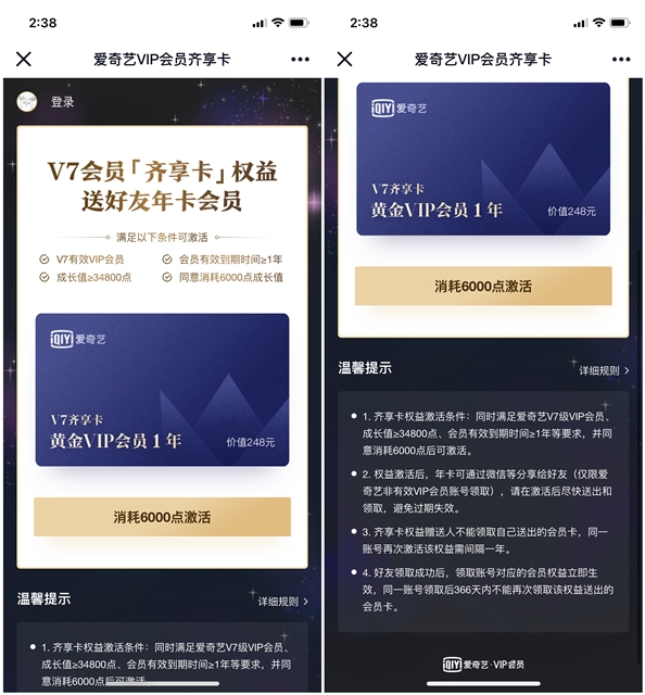 也就是赠送好友一张VIP7的爱奇艺黄金会员卡1年