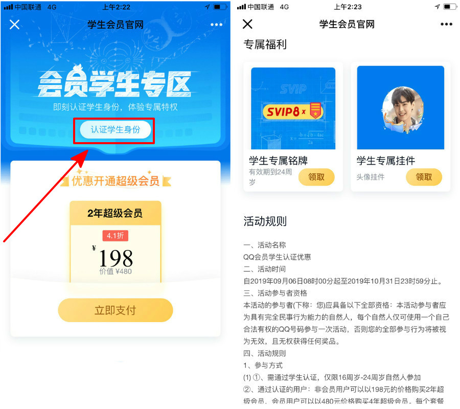 点击认证学生身份-填写信息-学校随便填-拍个照即可